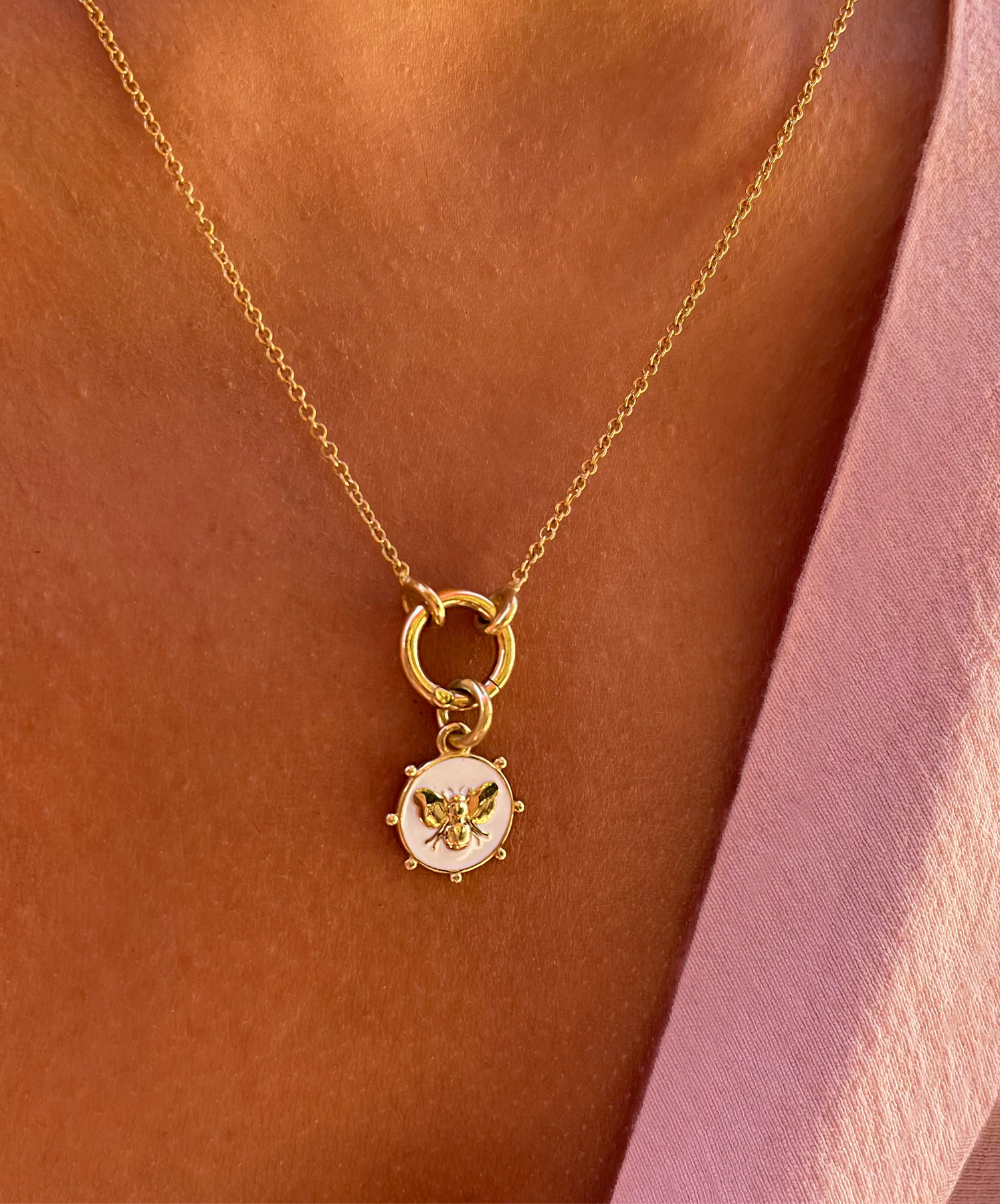 Indulge in the euphoric harmony symbolized by the bee from our exquisite collection of Mythical Treasures. Crafted by Haniotis Hellas, this captivating charm embodies the profound wisdom, balance, and harmony represented by the enchanting bee. Meticulously crafted from 18K gold and white enamel, each charm emanates an irrefutable elegance and timeless allure. Allow the bee's symbolic wisdom to guide you to a state of euphoric harmony, evoking a sense of inner bliss and fulfillment.